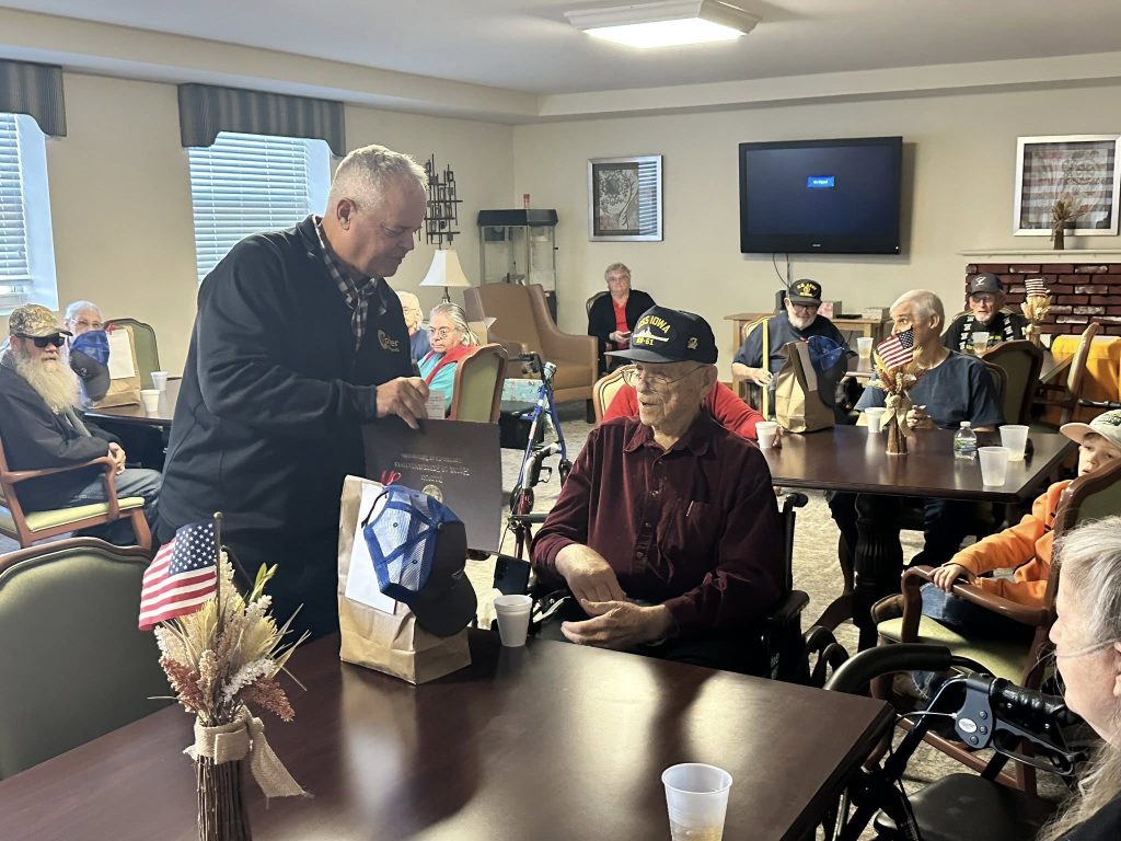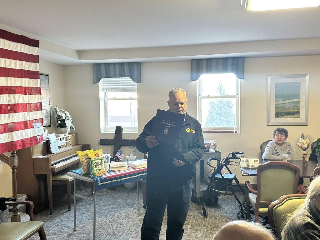 It was then off to Knox County Nursing Home to recognize over 20 resident veterans. I presented Certificates and a pin provided by Traditions Health. A representative from Compassus also presented a certificate. Each veteran received a warm quilt from Quilts of Valor.