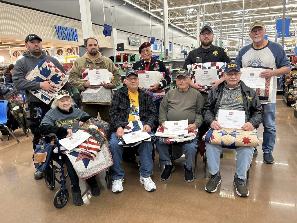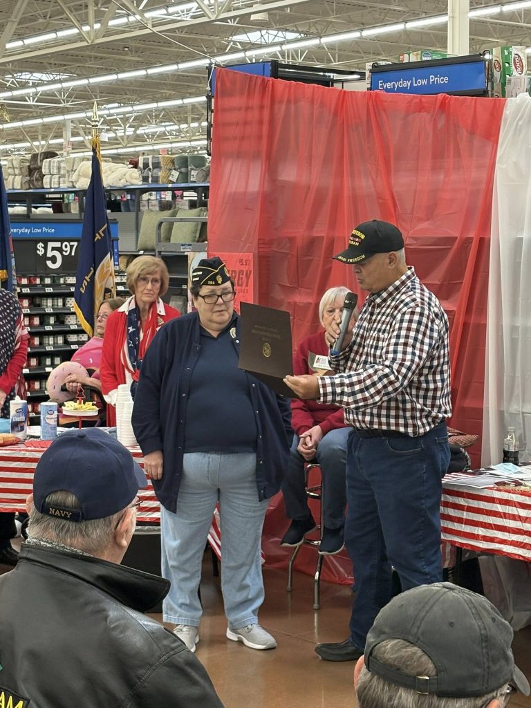 I then went to Wal-Mart to visit with veterans and recognize Cindy Unthank the first female Galesburg American Legion Commander. The DAR and Quilts of Valor presented quilts to many veterans. The local Girl Scouts presented hand-made cards for the veterans.