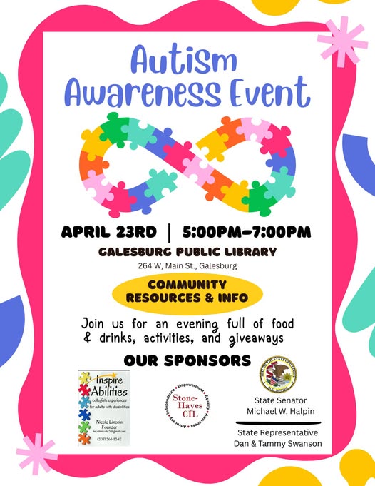On April 23rd we will be hosting the 4th annual Autism Awareness Event at the Galesburg Public Library.